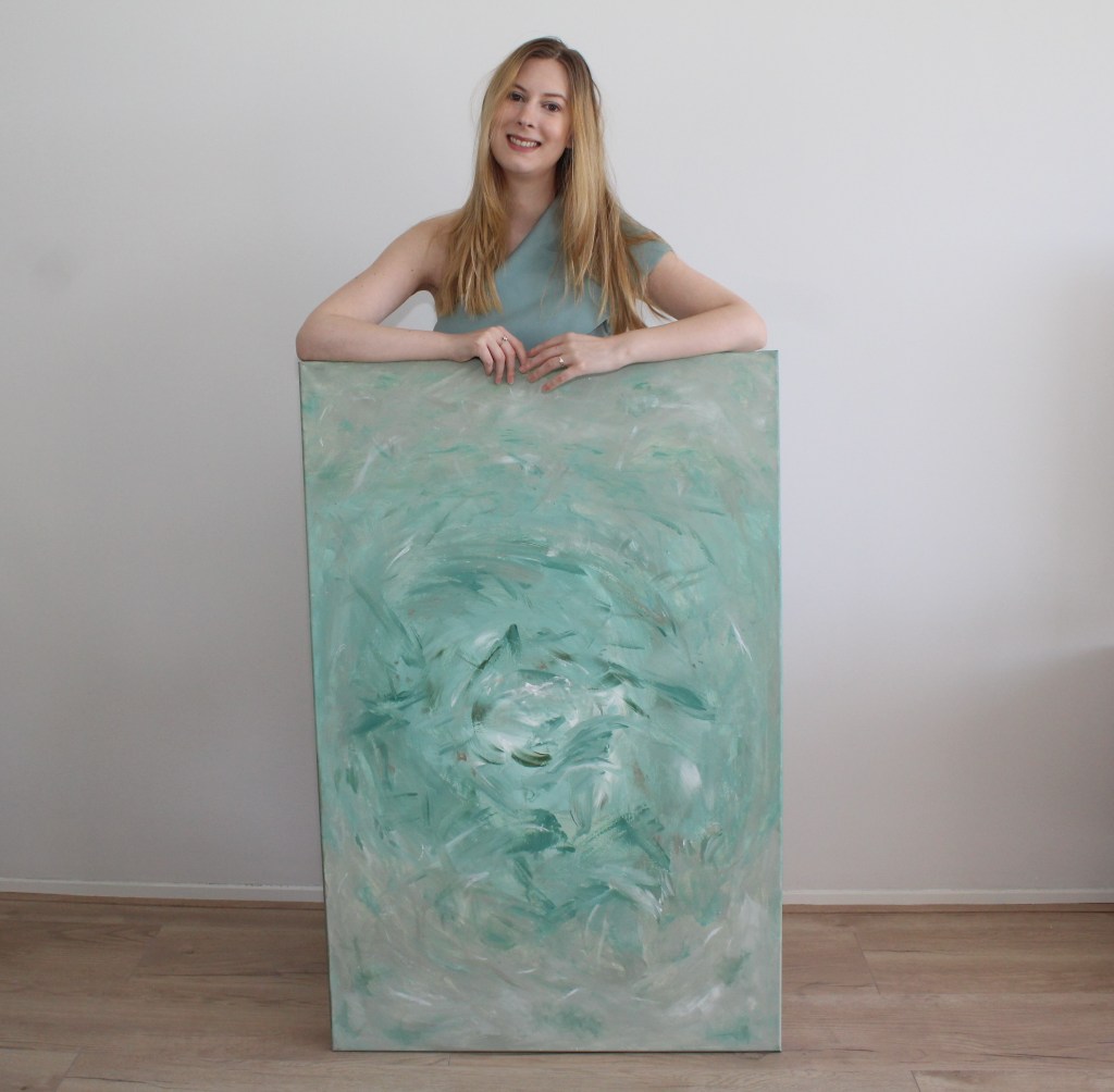 Soft minimalistic abstract art with minty green in the center and cool beige tones around the edges.